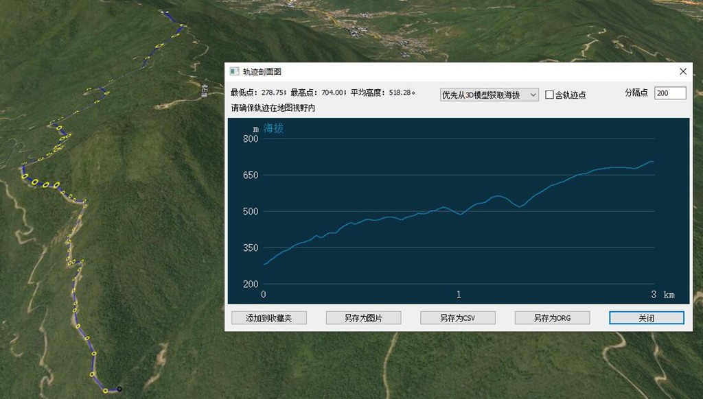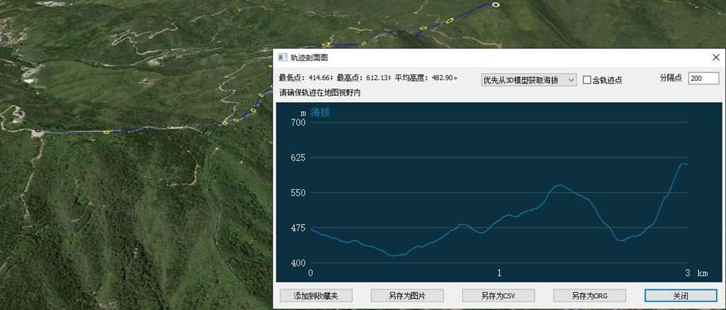 軌跡剖面圖的海拔可選擇通過(guò)軌跡點(diǎn)、高程數(shù)據(jù)或3D模型獲取,直接生成軌跡內(nèi)最低點(diǎn)、最高點(diǎn)及平均高度等數(shù)據(jù)。您也可以自行設(shè)置剖面分隔點(diǎn)個(gè)數(shù)(可選擇是否包含軌跡點(diǎn)),顯示不同精度的剖面圖,生成后的軌跡剖面圖可另存為圖片、CSV、ORG等文件格式,方便瀏覽傳閱。