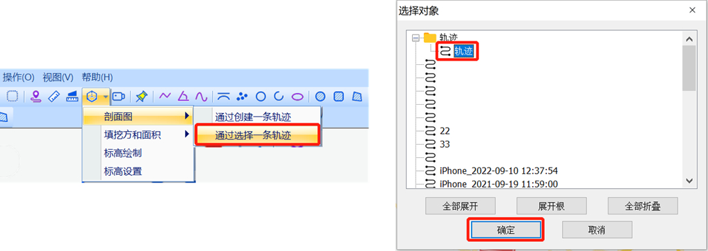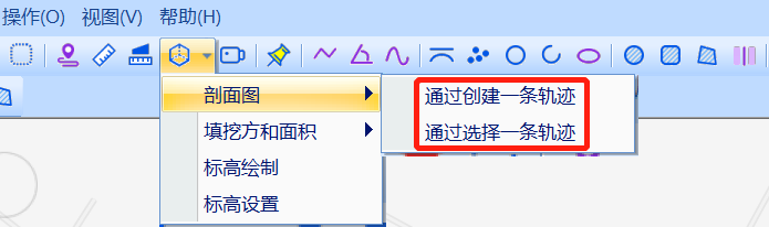 點(diǎn)擊工具欄圖片12按鈕—>【剖面圖】;這里您可以選擇兩種方式:通過(guò)創(chuàng)建一條軌跡,通過(guò)選擇一條軌跡。