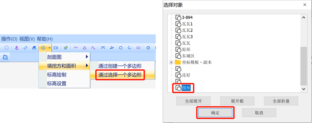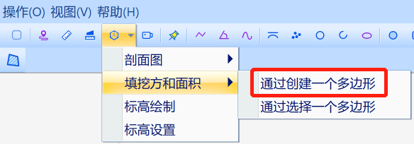 點(diǎn)擊工具欄圖片12按鈕—>【挖填方和面積】—>【通過(guò)選擇一個(gè)多邊形】,選擇一個(gè)多邊形,點(diǎn)擊【確定】。