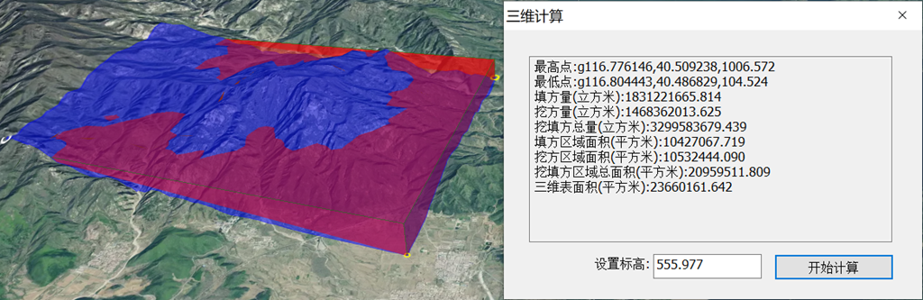 然后您設(shè)置標(biāo)高,點(diǎn)擊【開始計(jì)算】,系統(tǒng)自動(dòng)計(jì)算出最高點(diǎn)、最低點(diǎn)、挖填方量、挖填方區(qū)域面積、三維表面積等數(shù)據(jù)。