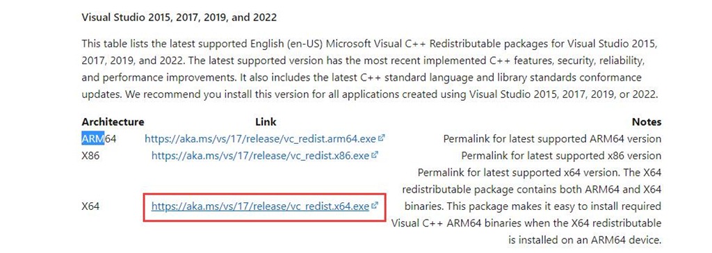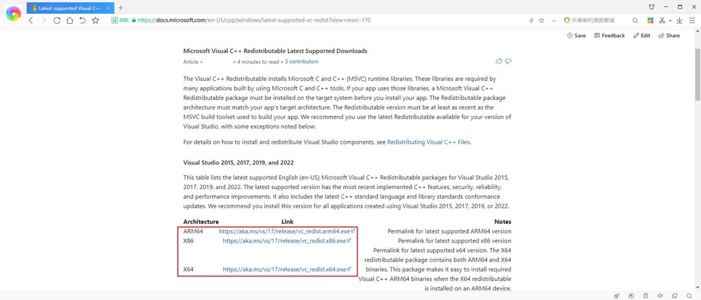 在瀏覽器中輸入網(wǎng)址(https://docs.microsoft.com/en-US/cpp/windows/latest-supported-vc-redist?view=msvc-170),下面有三個(gè)版本的VC++ Redist運(yùn)行庫(kù),您根據(jù)自己電腦的實(shí)際配置選擇。