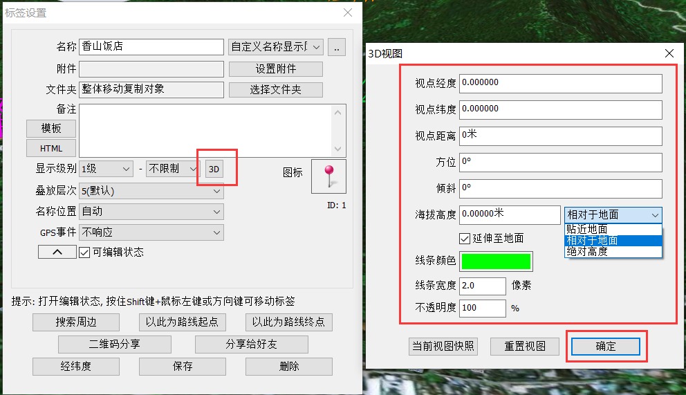 在[標(biāo)簽設(shè)置]窗口,點(diǎn)擊3D視圖設(shè)置,在3D視圖窗口,我們也可以調(diào)節(jié)文字的海拔高度、視點(diǎn)經(jīng)度、視點(diǎn)緯度、視點(diǎn)距離等參數(shù)值,設(shè)置完點(diǎn)擊確定,保存即可。