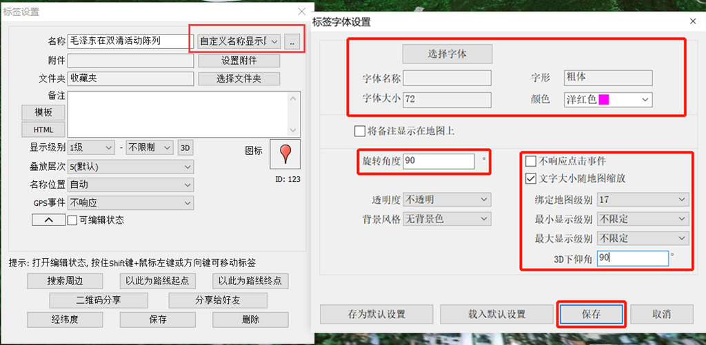在地圖窗口中點(diǎn)擊標(biāo)簽,進(jìn)入【標(biāo)簽設(shè)置】界面,在名稱后面的下拉列表選中[自定義名稱顯示風(fēng)格],點(diǎn)擊右側(cè)的 [..],在彈出的【標(biāo)簽字體設(shè)置】窗口,設(shè)置文字的字體大小、字形、顏色、旋轉(zhuǎn)角度,勾選文字大小隨地圖縮放,設(shè)置綁定地圖級(jí)別、3D下仰角等信息,點(diǎn)擊保存按鈕。