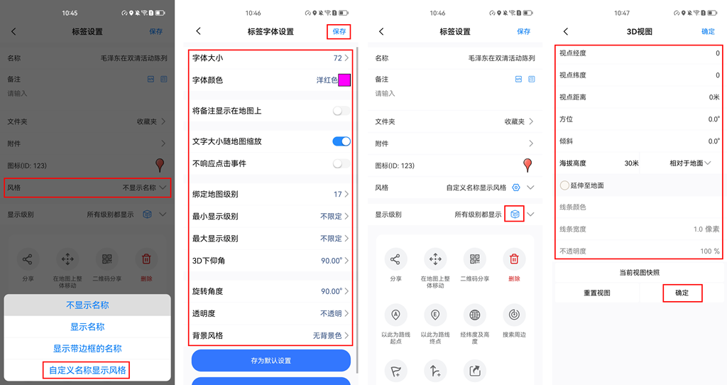 在地圖窗口中點(diǎn)擊標(biāo)簽,進(jìn)入【標(biāo)簽設(shè)置】界面,在風(fēng)格后面的下拉列表選中[自定義名稱顯示風(fēng)格],在彈出的【標(biāo)簽字體設(shè)置】窗口,設(shè)置文字的字體大小、顏色、旋轉(zhuǎn)角度,勾選文字大小隨地圖縮放,設(shè)置綁定地圖級(jí)別、3D下仰角等信息,點(diǎn)擊保存按鈕。