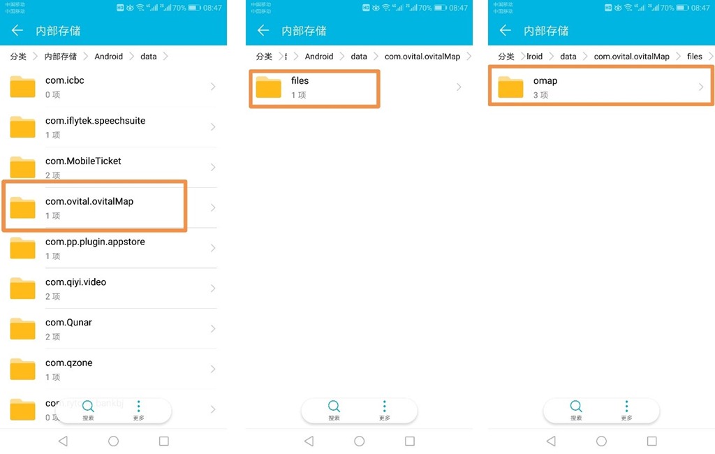 在Android設(shè)備上,奧維的根目錄為Android/data/com.ovital.ovitalMap/files/omap。