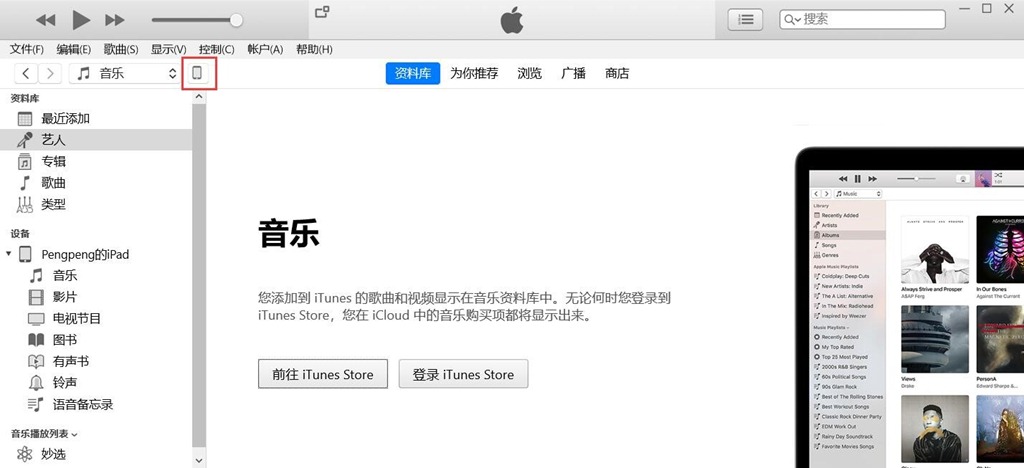 ④在iTunes的左上角,點(diǎn)擊5按鈕。