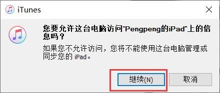 ③在iTunes主界面,會(huì)彈出下列提示,點(diǎn)擊【繼續(xù)】。