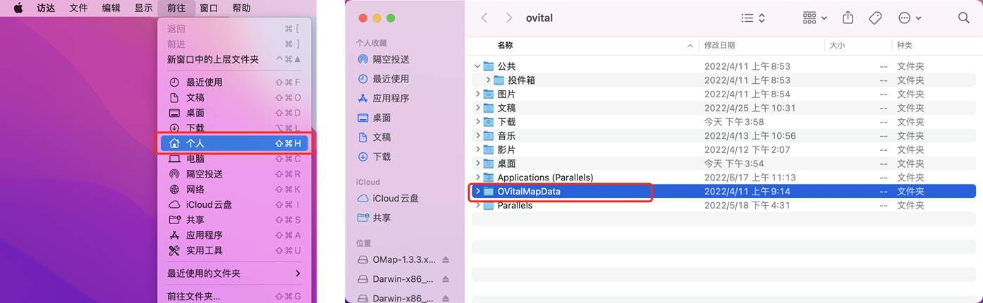 在桌面上點(diǎn)擊【前往】→【個人】→【OvitalMapData】,即可進(jìn)入奧維根目錄。