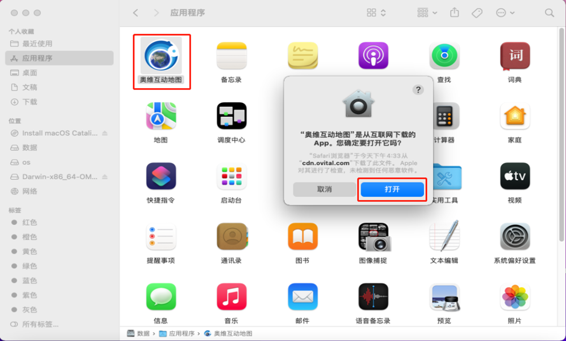 在[應(yīng)用程序]欄目,雙擊【奧維互動地圖】,點(diǎn)擊【打開】,即可執(zhí)行安裝。