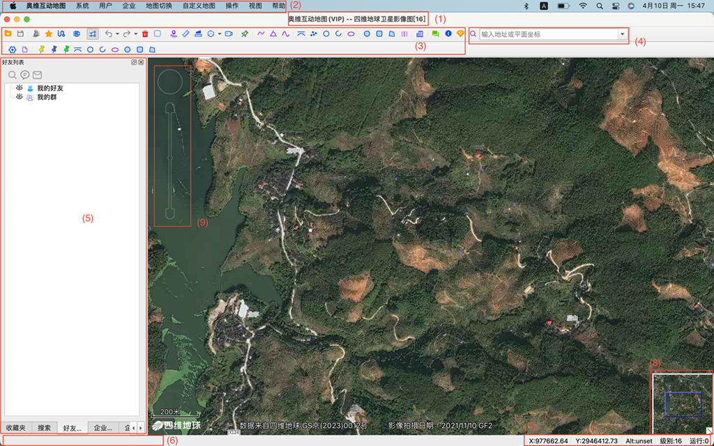 (1)標(biāo)題欄:包含軟件名稱、當(dāng)前綁定機(jī)器VIP等級、地圖類型及其當(dāng)前顯示級別;當(dāng)用戶登錄奧維賬號和企業(yè)賬號時(shí),會增加顯示當(dāng)前登錄的用戶名和企業(yè)用戶名。