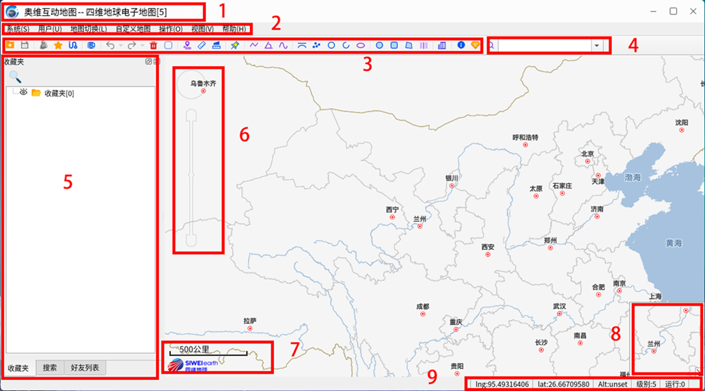 (9)狀態(tài)欄:顯示當(dāng)前鼠標(biāo)指針?biāo)谖恢玫慕?jīng)緯度值(或XY值)、海拔,當(dāng)前地圖顯示的地圖級(jí)別,軟件待運(yùn)行的任務(wù)數(shù)。