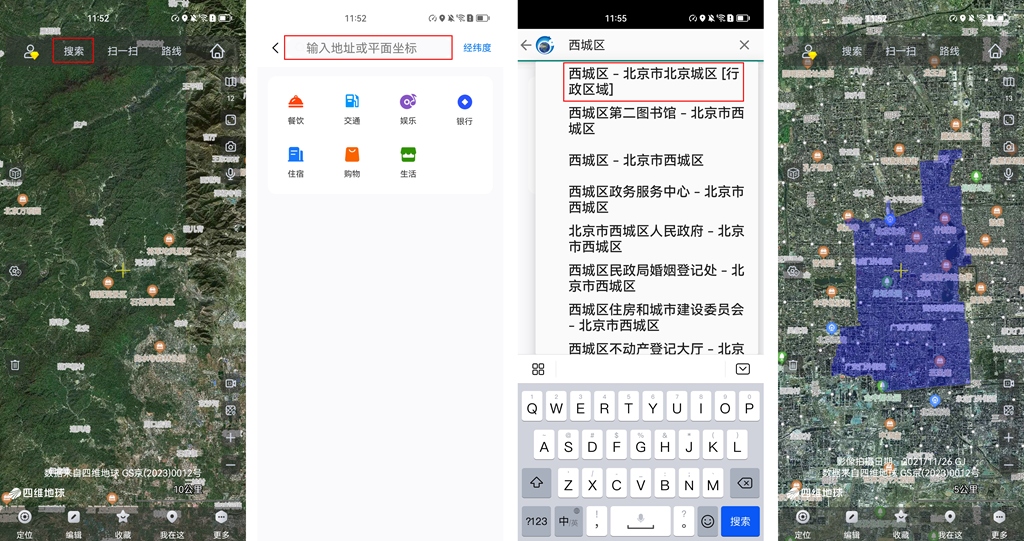 在主界面上,點擊【搜索】,輸入縣級行政區(qū)名,選擇【行政區(qū)域】這一地名選項,即可在地圖上顯示該縣級行政區(qū)。