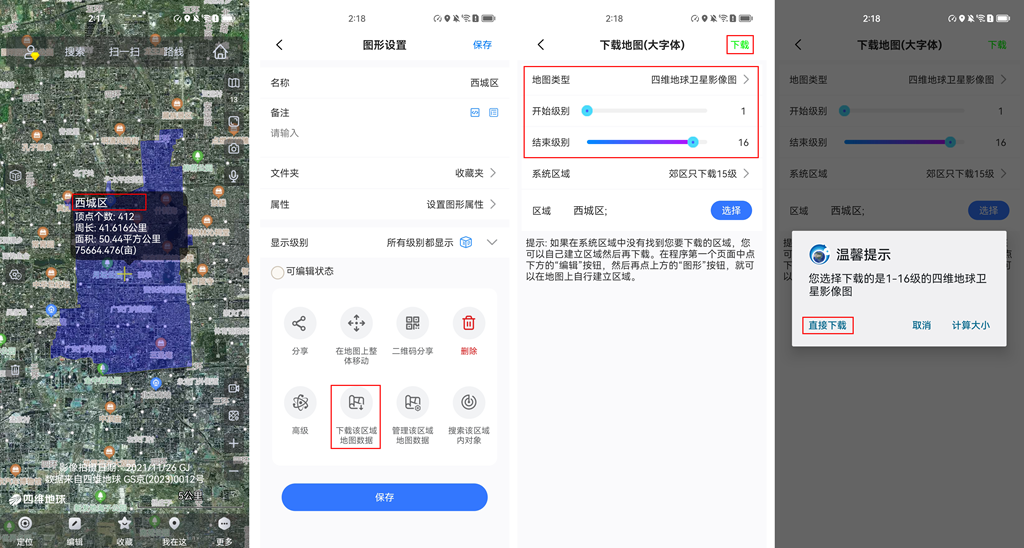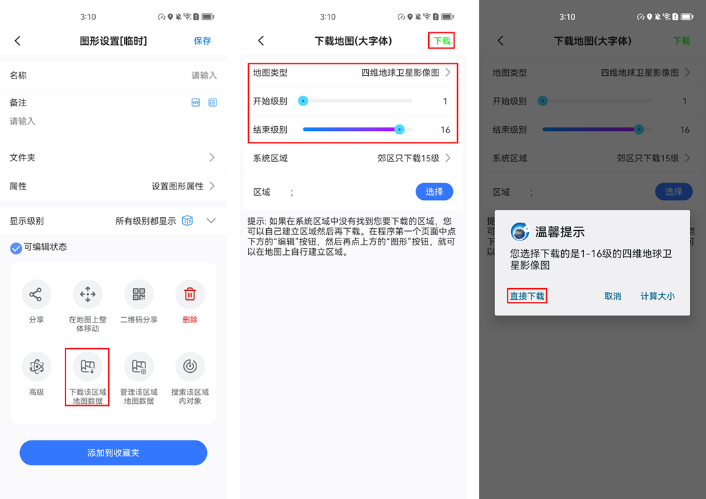 點擊該行政區(qū)域,點擊顯示名稱的位置,進入[圖形設置]頁面,點擊【下載該區(qū)域地圖數(shù)據(jù)】,進入[下載地圖]頁面。