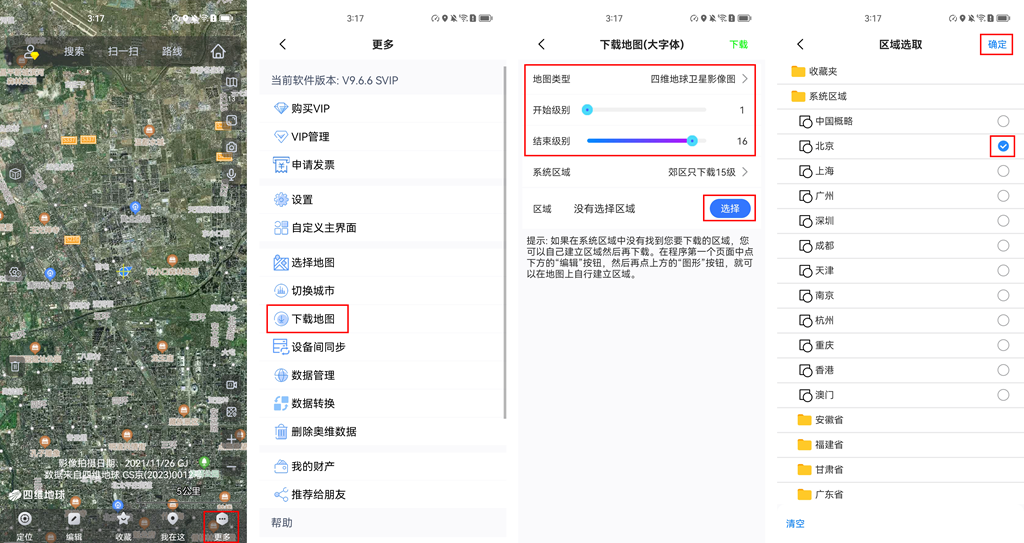 • 地圖類型:默認是當前瀏覽的地圖,下載四維地球電子地圖、四維地球衛(wèi)星影像圖和四維地球衛(wèi)星混合圖需要VIP(72元/年)。