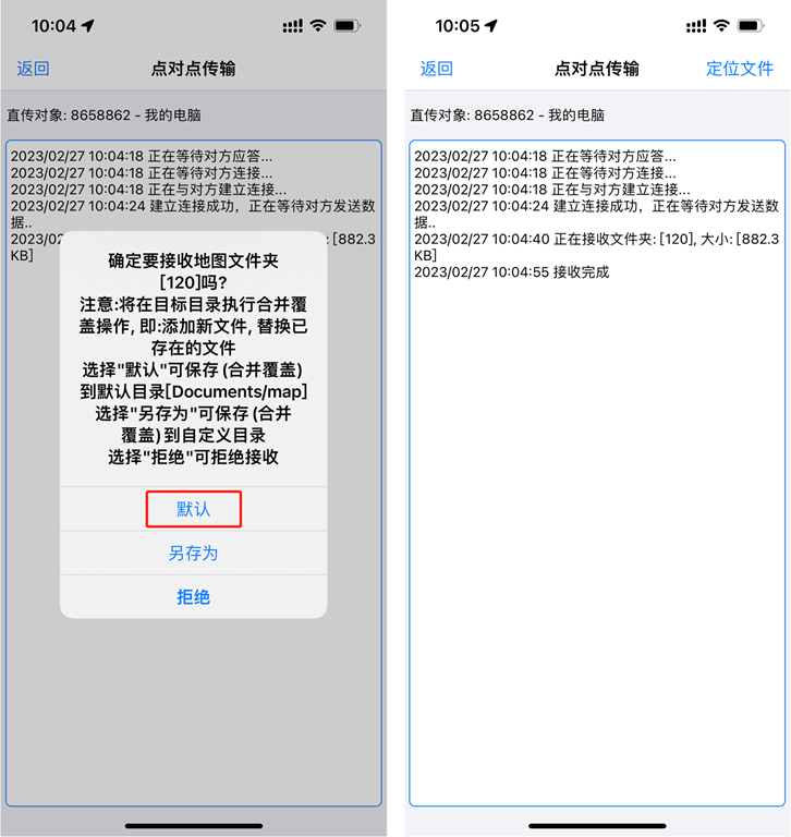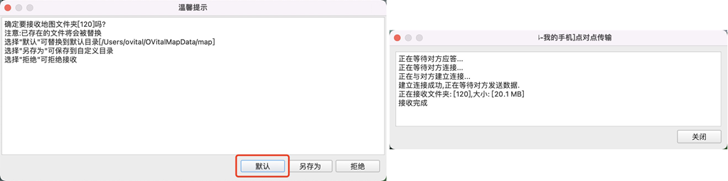 在手機(jī)端(或好友的奧維),彈出提示“是否接收地圖文件”,選擇【默認(rèn)】,等待窗口提示“接收完成”。