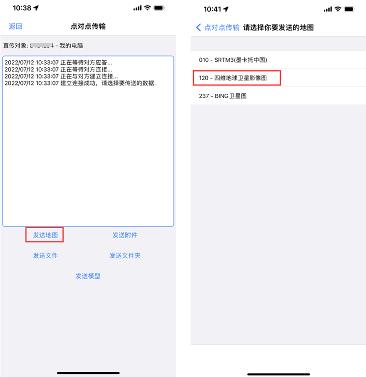 在手機(jī)端[點(diǎn)對點(diǎn)傳輸]界面,點(diǎn)擊【發(fā)送地圖】,選擇地圖文件。