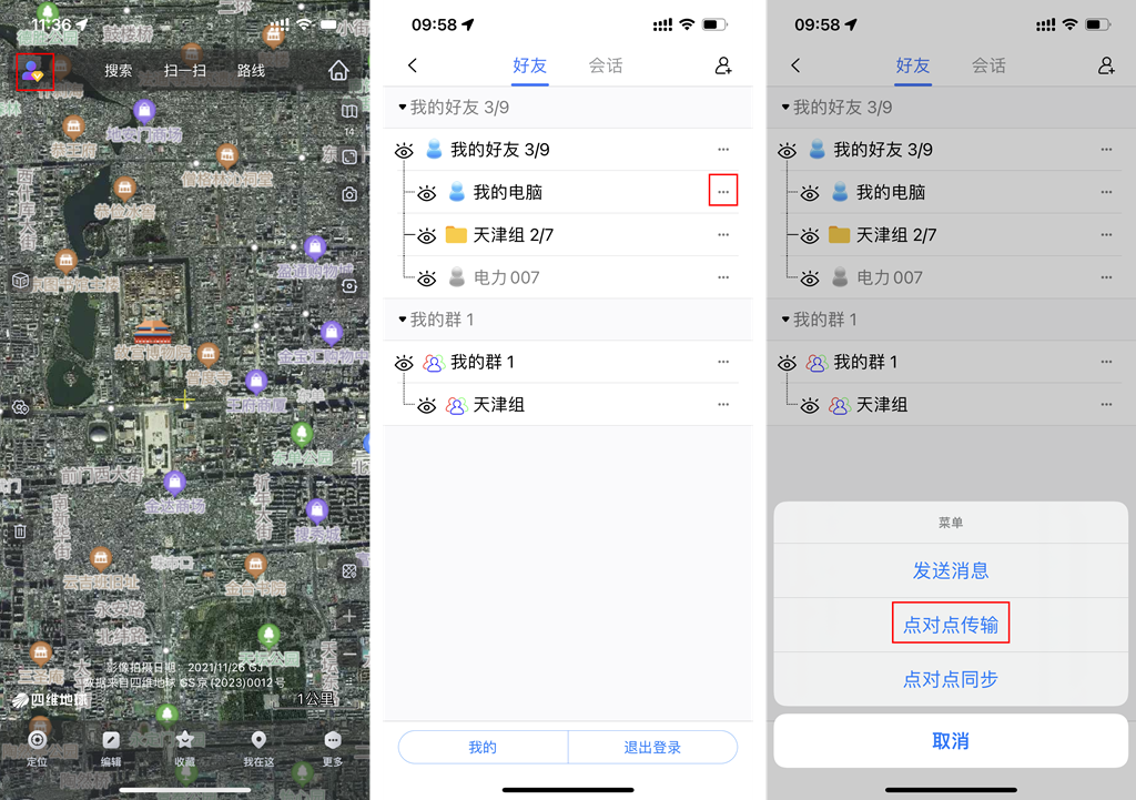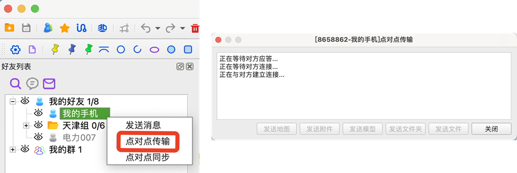發(fā)送者在電腦端[好友列表]中找到【我的手機(jī)】(或者對應(yīng)的好友),鼠標(biāo)右鍵,選擇【點(diǎn)對點(diǎn)傳輸】。地圖界面會彈出[點(diǎn)對點(diǎn)傳輸]界面。