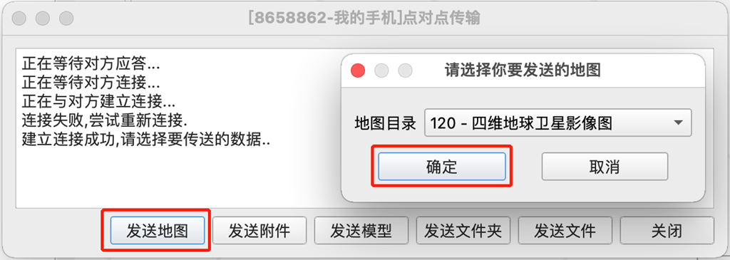 在電腦端的[點(diǎn)對點(diǎn)傳輸]頁面,點(diǎn)擊【發(fā)送地圖】,[地圖目錄]選擇您要發(fā)送離線地圖,點(diǎn)擊【確定】。