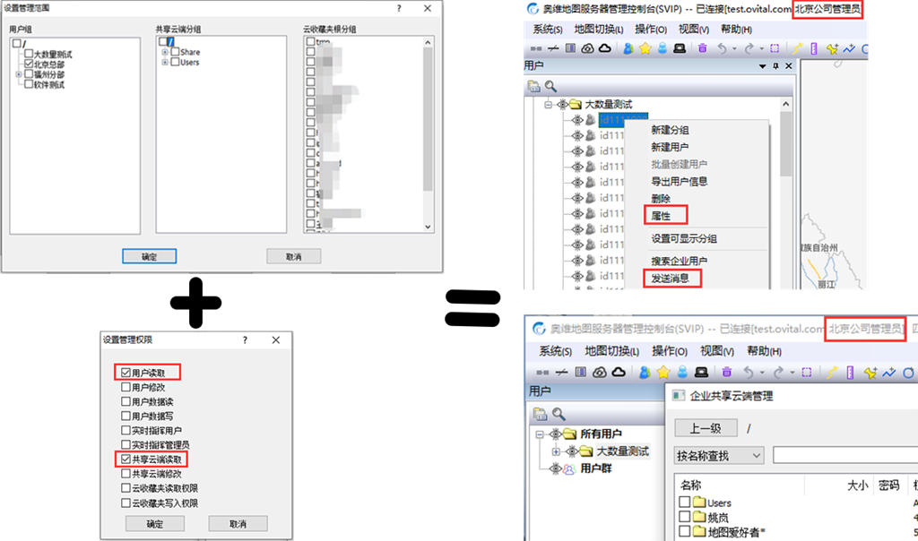 如下圖所示,開啟用戶讀取權限后,域管理員可以看到自己權限范圍內的用戶分組并可見組內用戶(非登陸狀態(tài)的用戶是灰度的),并可查看用戶"屬性",發(fā)送即時消息給用戶;開啟共享云端讀取權限后可見并可查看、下載所轄用戶共享云端數(shù)據(jù)。