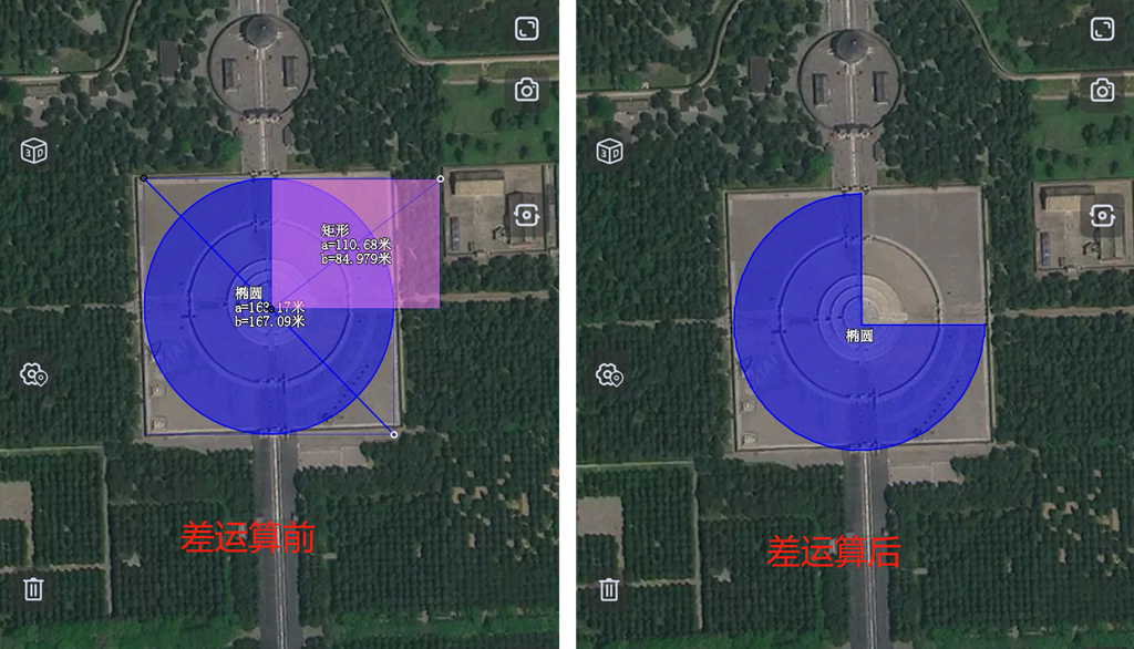 效果2:如下圖所示,一個橢圓和一個矩形作“差”運算(即“橢圓減矩形”),矩形被刪除(包括兩個圖形相交的部分)。